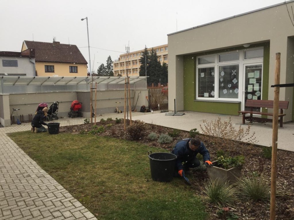 • vysadili nízké keře a trvalky a následně záhony u vchodu částečně zamulčovali