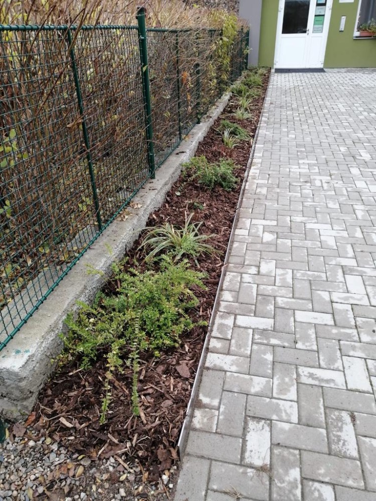 • osadili obrubník proti vysypávání mulčovací kůry z úzkého záhonu u vchodu